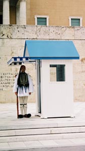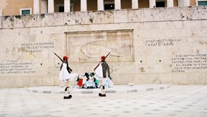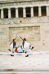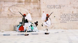 Les sentinelles de la garde (ou evzones) se tiennent sur la place Sindagma devant le monument au soldat inconnu. Ils sont vétus de jupettes (fustanelles) et chaussés de socques à ponpon. Ils évoluent en une sorte de ballet, remarquable de précision et de synchronisation. |